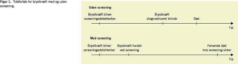 Screening af kvinder uden symptomer på brystkræft er baseret på en antagelse om, at tidligere diagnose fører til en bedre prognose og dermed også lavere dødelighed af sygdommen (Figur 1 ). Randomiserede forsøg viser en reduktion af dødeligheden af brystkræft på 25% for 50-69-årige kvinder, der bliver tilbudt screening [2]. En metaanalyse af otte kohortestudier af servicescreeningsprogrammer, dvs. programmer, der indgår som en del af de generelle sundhedsydelser, viser en reduktion i brystkræftdødeligheden på 28% for de kvinder, der bliver inviteret til screening [4]. For kvinder, der rent faktisk deltog i screeningen, lå reduktionen højere, nemlig på 43% i den samlede metaanalyse [4].