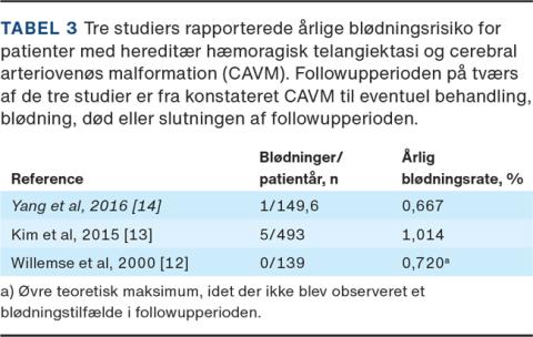 Vi har blot identificeret tre studier [12-14] på verdensplan, hvor man kvantificerer den årlige blødningsrisiko for CAVMs hos patienter med HHT (blødning pr. patientår) (Tabel 3). Fælles for disse studier er, at der er tale om små followupstudier eller retrospektive kohortestudier med blot 1-5 blødningstilfælde fordelt på 149-749 patientår. Kun i ét af studierne [12] anføres undertyper og gradering af CAVMs, og den neuroradiologiske status af patienternes CAVMs i de to andre studier kendes ikke. Det kan således ikke udelukkes, at Yang et al [14] og Kim et al [15] inkluderer de fredelige mikro-AVMs og derved underestimerer blødningsrisikoen for HHT-CAVMs af nidaltype.
