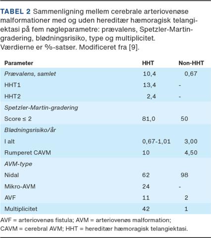 HHT-CAVMs adskiller sig på flere væsentlige punkter fra non-HHT-CAVMs (Tabel 2). Den samlede prævalens af CAVMs blandt patienter med HHT er således opgjort til 10,4%, fordelt med 13,4% hos patienter med HHT1 og 2,4% hos patienter med HHT2. For patienter uden HHT er prævalensen blot 0,65% [7]. Størstedelen af HHT-CAVMs-tilfældene er Spetzler-Martin grad 2 eller mindre og ikke udelukkende af nidal undertype (Tabel 2) [9]. Endelig gælder for patienter med HHT, at der ofte ses multiple CAVMs hos samme patient, hvilket er meget sjældent hos patienter uden HHT [9].