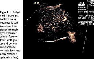 De hyppigst anvendte screeningsmetoder er α -føtoprotein og ultralydsskanning (Figur 1 ) [1, 3]. I en undersøgelse af screening randomiseredes knapt 19.000 patienter med kronisk hepatitis B [3]. I gruppen, der blev screenet hvert halve år med ultralyd og α-føtoprotein, var dødeligheden af HCC 83/ 100.000 observationsår, mod 131/100.000 i kontrolgruppen. I dette studie havde α-føtoprotein (ved en tærskelværdi på 20 ng/ml) en sensitivitet på 69% og en specificitet på 95%, ultralyd alene havde en sensitivitet på 84% og en specificitet på 97%, og kombinationen af de to havde både en sensitivitet og en specificitet på 92%. AASLD anbefaler ultralyd alene eller kombineret med α-føtoprotein [1].