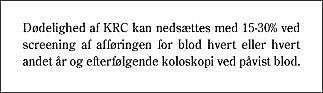 Langt de fleste tilfælde af KRC opstår efter 50-års-alderen. Det er sandsynliggjort i mange case-kontrolundersøgelser, at dødeligheden af KRC kan reduceres ved screening af afføringen for blod og koloskopi ved påvist blod. Cancerne er fundet i tidlige stadier og derfor med bedre prognose end ved almindelig diagnostik. Den solide videnskabelige evidens er opnået i tre store RCT (Minnesota, Nottingham, Fyn) med screening hvert eller hvert andet år i en længere årrække (6). Guaiacprøven Hemoccult-II (H-II) blev brugt i de tre RCT ( Boks 1 ).