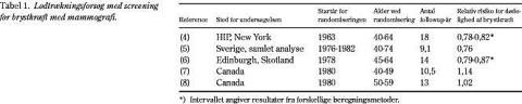 Screening for brystkræft med mammografi er den bedst undersøgte screeningsmetode. Der er foretaget i alt ni lodtrækningsforsøg - heraf fem i Sverige, som er blevet analyseret samlet (4-8). Ni år efter lodtrækningstidspunktet viste de svenske resultater en 24% lavere dødelighed af brystkræft i screeningsgruppen end i kontrolgruppen. Faldet var på 10% blandt kvinder, der var 40-49 år ved randomiseringen, 28% hos 50-59-årige, 31% hos 60-69-årige og 2% hos 70-74-årige. Ved opfølgning efter 13 år i den yngste aldersgruppe var faldet i dødeligheden af brystkræft 23% (9).
