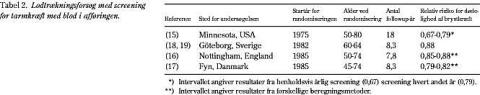 Blod i afføringen er dog den eneste test, som er blevet undersøgt i lodtrækningsforsøg. Der er en amerikansk (15) og tre europæiske undersøgelser (16-18). Den amerikanske undersøgelse inkluderede frivillige, og deltagelsen i første runde var 80%, mens de europæiske undersøgelser inkluderede alle sygdomsfrie borgere, og deltagelsen var mellem 53% og 67%. I de tre europæiske undersøgelser var der en nedgang i dødeligheden af tarmkræft på mellem 12% og 21%, mens nedgangen i det amerikanske studie var 21% for screening hvert andet år og 33% for årlig screening, se Tabel 2 . En metaanalyse af de fire forsøg viste et fald i dødeligheden af tarmkræft på 16% (19). Problemerne med screening for tarmkræft med blod i afføringen er, at deltagelsen er relativ lav og, at opfølgningen af positive fund skal ske med koloskopi.