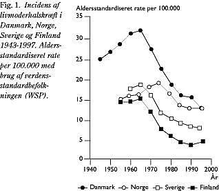 Med cytologisk undersøgelse af smear fra livmoderhalsen screener man for forstadier til kræft. Hvis screeningen virker, skal både incidensen og dødeligheden af livmoderhalskræft falde. Screeningen med smear- prøver er aldrig blevet afprøvet i et lodtrækningsforsøg. Den mest overbevisende evidens for en effekt af screeningen kommer fra de nordiske landes kræftstatistikker. I slutningen af 1960'erne havde både Finland, Sverige og Island landsdækkende organiserede screeningsprogrammer, og flere amter i Danmark havde det samme. Derimod var der kun organiseret screening i et enkelt norsk amt. I begyndelsen af 1970'erne faldt både incidensen (21) og dødeligheden (22) af livmoderhalskræft i Finland, Sverige, Island og Danmark. Derimod steg incidensen i Norge og begyndte først at falde ti år senere, Fig. 1 . Norge havde på det tidspunkt fået en omfattende uorganiseret brug af smear- prøver. Et nationalt norsk screeningsprogram startede i 1995 (23).