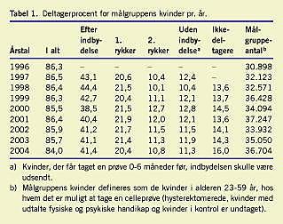 Målgruppens høje deltagerprocent på ca. 85 tilskrives dels en effekt af udsendelse af rykkere (Tabel 1), dels en løbende information til læger og kvinder, men informationen til kvinderne bør dog forbedres [7].