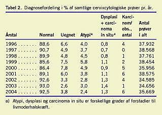 Diagnosefordelingen af de cervixcytologiske prøver fremgår af Tabel 2. Efter indførelsen af LBC i 2001 ses en stigning i den diagnostiske kvalitet, idet antallet af normale prøver forøges (fra 85-88% til 92-93%) samtidig med, at antallet af uegnede og falsk positive diagnoser reduceres, blandt andet pga. færre atypiske prøver.