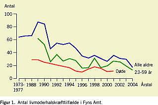 reduktion i antallet af livmoderhalskræfttilfælde fra 62 i 1988 til 18 i 2004