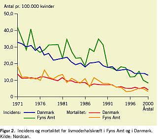 Som det ses af Figur 1 og Figur 2 har indførelsen af organiseret screening i Fyns Amt haft stor effekt på såvel incidensen som mortalitet af livmoderhalskræft.