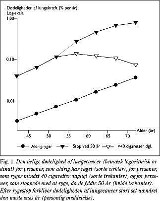 Lungecancer er den form for cancer, hvor der er det største potentiale for at »redde menneskeliv« ved screening. Det skyldes, at lungecancer kræver flere dødsfald end nogen anden form for cancer. I øjeblikket dør der lige så mange af lungecancer, som af de tre næsthyppigste cancerformer tilsammen, dvs. brystcancer, coloncancer og prostatacancer. I Danmark dør 92-95% af de diagnosticerede patienter af lungecancer, og prognosen har været uændret dårlig igennem de seneste 50 år (1). De fleste tilfælde diagnosticeres for sent, dvs. i stadium IV, hvor dødeligheden er nær ved 100%. Behandling i de tidligste stadier af sygdommen (stadium Ia) fører ofte til helbredelse, idet 5-års-overlevelsen er bedre end 60-85% (2, 3), og prognosen er væsentlig dårligere, når sygdommen har givet symptomer (2, 4). Endvidere tillader netop lungecancer, at screening kan begrænses til en mindre gruppe med høj risiko, nemlig personer, som har røget til deres 50. år (eller >20 pakkeår) (5). Disse personers årlige risiko for at udvikle lungekræft er større end 0,1%, og deres gennemsnitlige samlede risiko for at dø af lungecancer er over 10% (Fig. 1 ).