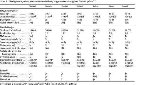Screeningsgruppen under Dansk Lungecancer Gruppe har i maj 2000 fremlagt et forslag til et projekt til evaluering af lavdosis CT til tidlig påvisning af lungecancer i Danmark. Det primære mål vil være at afklare, om en årlig screening med lavdosis CT og rygeafvænning er bedre end rygeafvænning alene til at reducere mortaliteten af lungecancer. Projektet vil omfatte 10.000 personer, der tænkes randomiseret til enten en screeningsgruppe (5.000 personer), som får foretaget lavdosis CT en gang årligt i fem år, eller en kontrolgruppe (5.000 personer), der ikke får foretaget CT (Tabel 1). Alle deltagere uanset gruppe vil blive tilbudt aktiv rygeafvænning i den tid, som projektet løber. Sekundære mål vil bl.a. være at vurdere psykosociale aspekter og livskvalitet ved at deltage i screeningsprogrammet, overlevelse og sygelighed i de to grupper, sundhedsmæssige omkostninger osv. Følgende inklusionskriterier vil bl.a. blive brugt: 1) ryger eller eksryger, som har røget til og med sit 50. år og med et akkumuleret tobaksforbrug på mindst 20 pakkeår, 2) alder 50-65 år på tidspunktet for randomisering, og 3) lungefunktionen skal være acceptabel, dvs. forceret eksspirationsvolumen i 1. s (FEV1) på mindst 1 l, og personen skal være i stand til at gå to etager op uden at stoppe (inden for 30 s). Screeningsundersøgelsen vil blive baseret på en fuld åben information om de mulige ulemper ved at deltage, efter godkendelse af den lokale videnskabsetiske komité. Deltagerne forventes rekrutteret i løbet af et år blandt indbyggere i Københavnsområdet, og undersøgelserne tænkes placeret på Amtssygehuset i Gentofte.