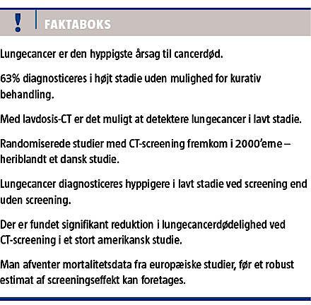 Formålet med denne artikel er at foretage en status over lungecancerscreening med CT, herunder at præsentere både nationale og internationale resultater [5-8] og at diskutere de mulige konsekvenser i Danmark.