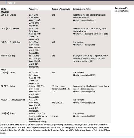 I alt syv europæiske randomiserede screeningsstudier så dagens lys i 2000’erne. I alle studierne sammenlignede man lavdosis CT-screening med ingen screening og havde lungecancerspecifik mortalitet som primært endepunkt. Trods samme primære endepunkt er der væsentlige forskelle i studieprotokollerne. I skrivende stund er screeningsperioden afsluttet for tre af dem, det danske Danish Lung Cancer Screening Trial (DLCST) [9, 10] og to italienske Detection and screening of early lung cancer by novel imaging technology and molecular essays (DANTE) [11] og Italian lung cancer computed tomography screening trial (ITALUNG) [12, 13]. I Tabel 1 vises en oversigt over de forskellige studiers design og de foreløbige resultater for lungecancermortalitet.