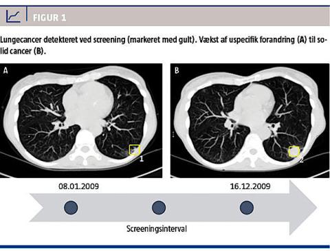 Lungecancer anses som den mest dødelige cancertype på verdensplan. I Danmark er lungecancer den næsthyppigste cancerdiagnose hos begge køn og den hyppigste årsag til cancerdød [1, 2]. I 2012 var der næsten lige så mange, der døde af lungecancer, som der døde af de tre hyppigste cancertyper tilsammen (mamma-, prostata- og coloncancer) [1]. Tobaksrygning er en velkendt risikofaktor og indgår i patogenesen i 90% af lungecancerne i den vestlige verden [3]. Overlevelse efter diagnosetidspunktet korrelerer kraftigt til sygdomsstadiet. En af de vigtigste årsager til den dårlige prognose er, at langt størstedelen af lungecancerne (63%) diagnosticeres i et højt stadie, hvor der ikke er mulighed for kurativt intenderet behandling [2]. Der er i de seneste årtier sket store fremskridt inden for billeddiagnostik og mindre invasive diagnostiske metoder til at få en præcis histopatologisk diagnose og stadieinddeling. På grund af bedre tilgængelighed og kvalitet af CT er det muligt at finde selv små forandringer i lungevæv. Dette har ført til stor interesse for tidlig diagnostik og derved mulighed for kurativ behandling. I håbet om at kunne nedsætte den høje mortalitet af lungecancer er der i løbet af 2000´erne blevet igangsat randomiserede undersøgelser med CT-screening af lungecancer.