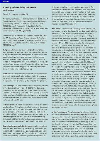 <li>Gilbody S, House A, Sheldon T et al. Screening and case finding instruments for depression. The Cochrane Database of Systematic Reviews 2005, Issue 4. Art. No.:CD002792. DOI:10.1002/14651858.CD002792.pub2.</li>