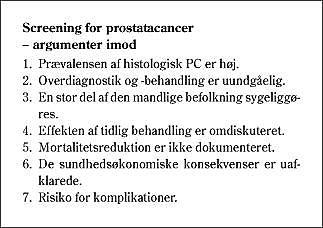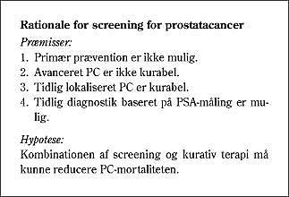 En forudsætning for screening er, at sygdommen gennemløber en fase, hvor tidlig diagnostik er mulig, samtidig med at sygdommen i denne fase er kurabel. Screening for PC opfylder dette kriterium. I longitudinale studier har man fundet, at PSA-baseret diagnostik kan fremrykke diagnosetidspunktet med 5-10 år (4). I flere screeningsstudier har man fundet, at både alder, tumorbyrde og histologisk gradering ændres i gunstig retning, og samtidig kan flere af de diagnosticerede tilfælde behandles kurativt (5). Disse observationer er forventelige ved screening og fremrykning af diagnosetidspunktet, men det egentlige mål, en reduktion af PC-mortaliteten (og -morbiditeten), er aldrig overbevisende dokumenteret i randomiserede undersøgelser. Amerikanske og canadiske resultater har dog vist, at PC-mortaliteten er faldende i disse to lande, hvor PSA-baseret screening advokeres og praktiseres (6-8) (Boks 1 ).