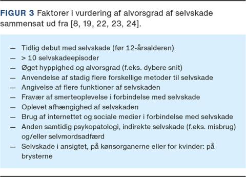 De hyppigste former for selvskade er at skære, slå eller brænde sig selv, hvor der er en overvægt af piger og kvinder, der skærer sig selv, mens en overvægt af drenge og mænd slår eller brænder sig selv [15]. Det er en udbredt misforståelse, at selvskade er synonymt med at skære sig selv (cutting), og det er således en vigtig pointe, at screeningen eksplicit nævner andre former for selvskade, uden dog at nævne så mange, at det kan virke som inspirationskilde for den unge. Desuden specificeres det, at der spørges ind til selvskade, som ikke er udført med selvmordsintention. De 3 F’er kan imidlertid oplagt anvendes i direkte forlængelse af spørgsmål, som afdækker selvmordsrisiko. Anvendelsen af flere metoder til selvskade er forbundet med dårligere prognose og øget risiko for selvmordsadfærd [16].