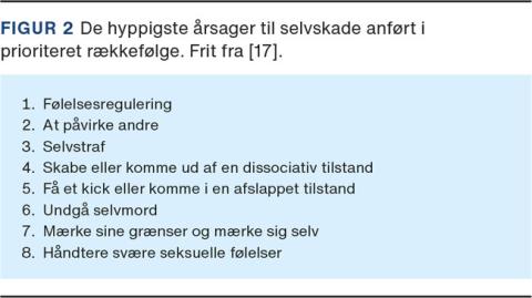 I mere end 150 undersøgelser har man set på, hvad der driver en person til at skade sig selv, og det hyppigste motiv til selvskade er affektregulering [17, 18]. Selvskade virker umiddelbart nedregulerende på svære følelser. Andre intrapersonelle motiver til selvskade kan være ønsket om at straffe sig selv eller at få et »kick« (Figur 2). Sociale eller interpersonelle motiver til selvskade kan være at kommunikere til andre, hvordan man har det og på den måde få den hjælp, omsorg eller opmærksomhed, som man har brug for. En del unge bruger internettet og sociale medier til at kommunikere med andre om deres selvskade. Under funktion spørges der derfor ind til den interaktion, den unge har med andre på digitale medier i forbindelse med selvskade. Der er fundet en sammenhæng mellem brug af digitale fællesskaber med fokus på selvskade og forøget risiko for udvikling af psykopatologi og selvmordsadfærd [19].