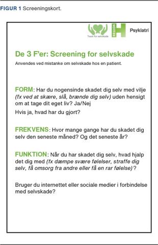 De 3 F’er udviklet som et letanvendeligt instrument til systematisk opsporing af direkte selvskade hos patienter. Over de seneste to år er det blevet implementeret i alle ambulatorier i BUC i Region Hovedstaden. Alle unge fra 13 år og ældre screenes, uanset hvilken psykiatrisk problemstilling de er henvist med, ved indledende vurdering og derefter ved behov under et psykiatrisk udrednings- eller behandlingsforløb. De 3 F’er kan anvendes af alle faggrupper og er udviklet med afsæt i de førnævnte mere omfattende og validerede spørgeskemaer samt DSM-5-forskningsdiagnosen [8]. Idet screeningen er udformet til at indgå i en bred indledende psykiatrisk vurdering, er den kortfattet, letanvendelig og fokuserer på de vigtigste karakteristika ved patientens selvskade, nemlig selvskadens form, frekvens og funktion (Figur 1).