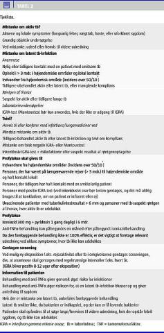 Der er solid evidens for, at profylaktisk behandling af udvalgte grupper, hvor man har mistanke om infektion, nedsætter risikoen for senere udvikling af tb [1, 6, 10]. Der foreligger dog ingen randomiserede studier, hvor man har påvist en effekt af screening og forebyggelse blandt patienter, der var i behandling med anti-TNF α, men man har set en markant reduktion i incidensen af tb i denne gruppe, efter at der er indført screening og forebyggende behandling [5, 11]. Der foreligger internationale retningslinjer [3, 6, 12, 13], og opdaterede danske retningslinjer ligger på de relevante specialeselskabers hjemmesider, retningslinjerne er resumeret i Tabel 2 .