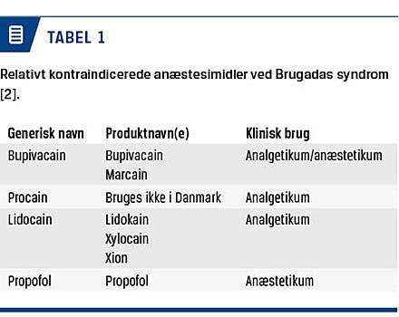 BS er en autosomal dominant hjertesygdom, hvor 20-30% af tilfældene skyldes mutationer i SCN5A, der koder for hjertets natriumkanaler [1]. De øvrige sygdomstilfælde kan endnu ikke forklares genetisk. Nogle lægemidler og feber kan forårsage fatale arytmier hos patienter med BS [2]. På www.brugadadrugs.org er der oplysninger om lægemidler, der er relativt kontraindiceret hos patienter med BS (Tabel 1) [2]. Heriblandt findes propofol, bupivacain og lidocain, der rutinemæssigt anvendes i anæstesien, hvorfor det er en anæstesiologisk udfordring at bedøve patienter med BS. Generel anæstesi med thiopental og sevofluran anbefales til patienter med BS [3]. Dog er der i litteraturen beskrevet neuroaksiale blokader med bupivacain uden forekomst af komplikationer [1,3-5].