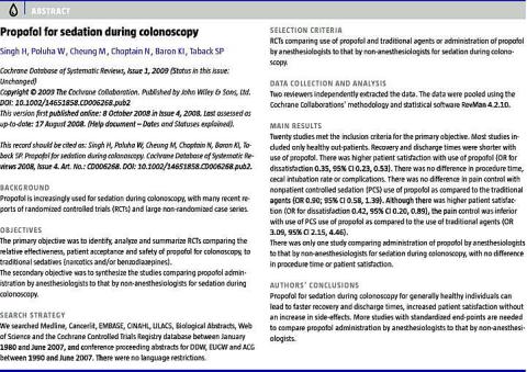 I Cochranesamarbejdets metaanalyse af propofols anvendelse til sedation ved koloskopi finder man, at propofol giver hurtigere opvågning og udskrivelse samt højere patienttilfredshed sammenlignet med traditionelle sedativa uden, at man finder en øget komplikationsrate. Man må opgive det sekundære mål: at undersøge sedation ved nonanæstesiologisk personale versus anæstesiologisk personale grundet mangel på studier. Propofol ses som et brugbart alternativ til sedation af patienter i American Society of Anesthesiologists (ASA)-gruppe I-II ved koloskopi.
