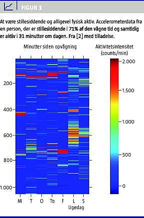 Ifølge Sundhedsstyrelsens anbefalinger bør voksne være fysisk aktive mindst 30 minutter om dagen. Denne anbefaling er i øvrigt enslydende i de fleste vestlige lande. Det paradoksale er, at man sagtens kan efterkomme anbefalingen og samtidig være yderst stillesiddende. Det gælder f.eks. for en kontoransat, der cykler til og fra arbejde og tilbringer dagen bag et skrivebord og aftenen på sofaen. Fænomenet har givet anledning til den spøgefulde betegnelse »den aktive sofakartoffel« [1, 2]. Figur 1 viser et eksempel på data for en sådan person, som samlet set er aktiv i 31 minutter om dagen og hovedsageligt stillesiddende i den resterende tid. Det ses endvidere, at personen i lange perioder sidder stille uden afbræk.