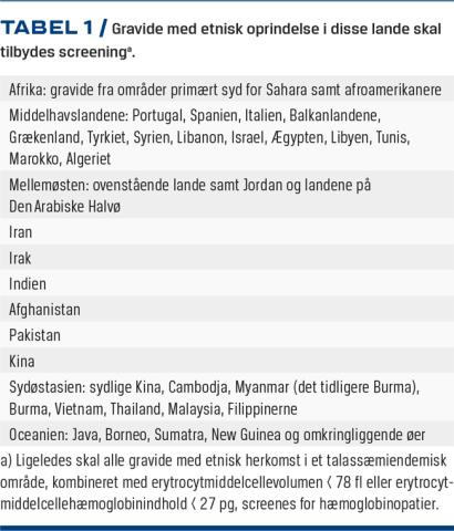 Sundhedsstyrelsens svangreomsorg anbefaler, at alle gravide, som stammer fra områder med høj prævalens af SCD (Tabel 1) skal screenes for hæmoglobinopatier ved første svangreundersøgelse hos en praktiserende læge.