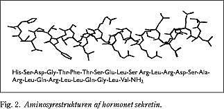 Tidlige forest illinger om at sekretin kunne være en simpel kemisk substans (som fx adrenalin) blev ikke indfriet. I 1928 adskilte A.C. Ivy (1893-1978) sekretin fra cholecystokinin (CCK) (19). Forhåbningerne om, at man havde isoleret sekretin i 1938, viste sig at være falske (20). Der var væsentlige problemer med instabilitet og aktivitetstab. E. Jorpes og V. Mutt påbegyndte i 1952 arbejdet med isolering af sekretin, ti år senere lykkedes det, og efterfølgende blev aminosyresekvensen bestemt (21-24) (Fig. 2 ). Denne opgaves heroiske karakter illustreres af det forhold, at for at få 1 mg renset sekretin var det nødvendigt at starte med én kilometer tyndtarm (20). Syntese af et sekretinpræparat, der i styrke var identisk med naturligt sekretin, blev fuldført af M. Bodanszky et al i 1966 (22). Sekretin endte med at blive et af de sidste gastrointestinale hormoner, der blev klonet. Dette skyldtes delvis dets meget høje indhold af lysin, arginin og serin. Sekretin-prækursoren består af et signal-peptid, et kort N-terminal-peptid, sekretin, en glysin-lysin-arginin-amidspaltende sekvens og yderligere 72 aminosyrer i den C-terminale ende (16, 20).