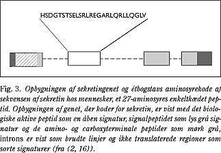Strukturanalyse af genet, der koder for sekretin, har vist, at den transkriberende enhed er delt i fire exons med 813 basepar (Fig. 3 ). Sekretingenet koder tilsyneladende kun for en enkelt kopi af det biologisk aktive peptid (16), og det er det eneste medlem af familien, som ikke har en intron, der adskiller de transkriptionale og translationale startsteder.