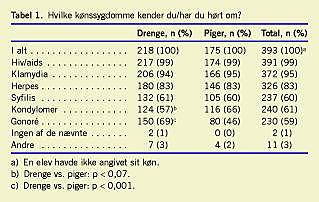 Kendskabet til kønssygdomme som hiv/aids, klamydia og herpes fandtes højt (> 80% af eleverne), mens kun mellem 46 og 66% af eleverne havde hørt om eller kendte til syfilis, gonoré og kondylomer (Tabel 1). To angav, at de ikke kendte nogen af de nævnte kønssygdomme, og i alt 11 nævnte yderligere sygdomme. Adspurgt om hvilken kønssygdom, der er den hyppigste, angav 57 (15%) to sygdomme. Samlet svarede 125 drenge (58%) og 132 piger (76%) klamydia (p < 0,0001, piger vs. drenge), mens 56 drenge (26%) og 48 piger (27%) svarede aids/hiv (p < 0,75). I alt 28 drenge (13%) og ti piger (6%) svarede ved ikke eller blankt. Samlejedebut øgede kendskabet til klamydia som hyppigste kønssygdom til 85% hos pigerne (piger for sig: +samleje vs. -samleje, p < 0,03) og stadig med en kønsforskel i det rigtige svar (p < 0,003, drenge (62%) vs. piger). Kun 55% af drengene uden samlejeerfaring angav klamydia som hyppigste kønssygdom. Kendskabet til kønssygdomme og angivelse af den hyppigste kønssygdom var ikke associeret med tilfredsheden med seksualundervisningen i skolen, idet 22-27% angav, at de havde behov for mere undervisning.