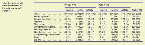 Viden om klamydias symptomer og følgetilstande kan karakteriseres som noget usikker (Tabel 2). Pigerne var i højere grad end drengene klar over, at klamydia kunne medføre sterilitet (p< 0,001, piger vs. drenge), og at sygdommen ikke nødvendigvis gav symptomer (p < 0,02). Endvidere angav de, der havde haft samleje, hyppigere dysuri som symptom end dem, der ikke havde debuteret seksuelt (p < 0,02). På spørgsmålet om, hvorvidt forældrene skulle vide det, hvis eleven ville drøfte prævention med egen læge, svarede over halvdelen med samlejeerfaring rigtigt (53%) mod kun 26% af de øvrige (p < 0,0001); de rigtige svar var ligeligt fordelt mellem kønnene. Dog var drengene uden samlejeerfaring mindre vidende om dette emne end pigerne, idet kun 18% af disse svarede rigtigt mod 38% af pigerne (p < 0,01).