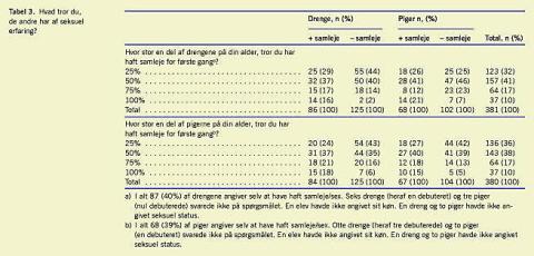 Man kan få et indtryk af graden af kommunikation mellem eleverne om seksuelle emner ved at spørge om, hvad man tror, andre har af seksuel erfaring (Tabel 3). Ved opgørelsen regnede vi det som et rigtigt svar, hvis man havde skønnet, at enten en fjerdedel eller halvdelen havde haft seksuel debut. Med hensyn til at tro, hvor mange af drengene der har haft samleje, så skønner de drenge, der ikke har debuteret, bedre end drenge og piger, der har haft samleje (hhv. p< 0,001 og p < 0,02) og bedre end piger, der ikke har debuteret (p < 0,03). I alt 84% af drengene skønner rigtigt over, hvor mange drenge, der har haft samleje. Der var signifikant flere af drengene med samlejedebut, som skønnede højere end ikkedebuterede drenge (p < 0,005). Skønnet over, hvor stor en andel af pigerne, der har debuteret, er ligeligt fordelt efter køn, men ikke efter samlejedebut. Igen er det dem, der ikke har debuteret, som skønner bedst, idet hhv. 77% af drengene og 81% af pigerne skønner i overensstemmelse med det rigtige svar. For dem, der har haft samleje, er det kun 61% af drengene og 67% af pigerne, som skønner rigtigt (+samleje vs. -samleje, p< 0,0007). Der er ingen forskel mellem drenge og piger ved sammenligningen af deres samlede skøn af, om nogen har haft samleje.