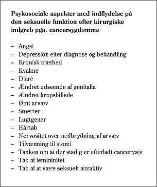 Større abdominalkirurgiske indgreb synes ikke at forandre samlejefrekvensen, orgasmefrekvensen eller -kvaliteten, dys-pareuni eller vaginalt udflåd i negativ retning, så længe rectum lades urørt, og kvinden ikke får stomi. Ved ekstirpation af rectum rapporteres det, at op mod 15% af kvinderne har libidoproblemer og problemer med vaginal tørhed (7). Er stomianlæggelse nødvendig, men stomien ikke permanent, har kun 30% af kvinderne samleje i stomiperioden, og i tilfælde af permanent stomi bliver seksualfunktionen forringet. Også radikal cystektomi ved blærecancer har stor indflydelse på den seksuelle funktion med dyspareuni, vaginal tørhed samt generel seksuel dysfunktion pga. den medfølgende psykosociale morbiditet (8). En del patienter genoptager aldrig seksuallivet.