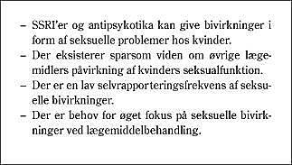Det er velkendt, at visse lægemidler kan give seksuelle bivirkninger hos mænd som tidligere beskrevet (1). Formålet med denne artikel er at give en opdateret status vedrørende seksuelle dysfunktioner som bivirkning til lægemiddelbehandling hos kvinder.