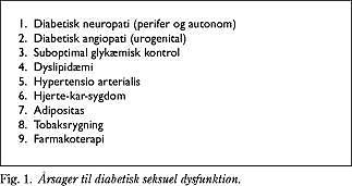 Tidligere opfattedes diabetisk seksuel dysfunktion som en overvejende psykogent betinget tilstand, men der er nu konsensus om, at ætiologien er multifaktoriel og overvejende hviler på et organisk grundlag (Fig. 1 ). Almindeligvis anses diabetisk neuropati (perifer og autonom) samt diabetisk angiopati (urogenitalt) for at være blandt hovedårsagerne, men deres relative indbyrdes betydning er ikke kendt. Metaboliske faktorer såsom glykæmisk kontrol og lipidmetabolisme har betydning også som isolerede faktorer, og andre komplikationer til diabetes mellitus, som for eksempel hjerte-kar-sygdom, hypertension og adipositas, bidrager til tilstanden. En fællesnævner for flere af de ovennævnte årsager er endotelcelledysfunktion, som er en hyppig tilstand hos diabetikere, og i øvrigt danner et grundlag for mulig farmakologisk behandling. Multifarmakoterapi er almindelig hos diabetikere, og en lang række medikamenter kan alene eller i kombination forårsage eller bidrage til seksuel dysfunktion hos såvel kvinder som mænd. Endelig må det nævnes, at organisk seksuel dysfunktion hos både kvinder og mænd ofte medfører en psykisk påvirkning, som i sig selv kan forværre tilstanden og kræve behandling.