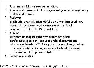 Det er tankevækkende, at nogle diabetikere trods adskillige års diabetesvarighed, langvarig glykæmisk dysregulation og svære senkomplikationer har normal seksuel funktion, mens andre med kort diabetesvarighed, acceptabel glykæmisk regulation og uden diabetiske senkomplikationer kan have nedsat eller udslukt seksuel funktion. Dette understreger tilstandens kompleksitet og formentlig multifaktorielle grundlag. For at kunne yde optimal behandling er det derfor af stor betydning at afdække og beskrive mulige organiske årsager gennem en solid anamnese og en grundig klinisk og biokemisk undersøgelse (Fig. 2 ). For mændenes vedkommende volder det at stille diagnosen erektil dysfunktion oftest ingen vanskeligheder, men man bør tillige være opmærksom på kendte diabetiske følgetilstande som retrograd ejakulation og ejaculatio præcox. For kvindernes vedkommende er tilstanden langt mere kompleks og vanskeligere at beskrive og omfatter almindeligvis begreberne nedsat libido, dyspareuni, svigtende arousal, nedsat lubrikation og vanskeligheder med at opnå orgasme.