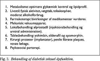 Diabetes mellitus type 1 og type 2 er formentlig den hyppigste årsag til seksuel dysfunktion både hos kvinder og mænd. Generelt antages det, at tilstanden er omtrent dobbelt så hyppig hos diabetikere som hos baggrundsbefolkningen. En række undersøgelser angiver varierende incidenser af erektil dysfunktion på 50% eller derover hos diabetiske mænd, og formentlig er størrelsesordenen tilsvarende for seksuel dysfunktion hos diabetiske kvinder. Når man hertil lægger, at tilstanden generelt og især for kvindernes vedkommende er underrapporteret, og at incidensen af diabetes mellitus, specielt type 2, er kraftigt stigende, må man konkludere, at der foreligger et udækket og stadigt stigende behov for diagnosticering og behandling af denne patientgruppe. Hensigten med denne artikel er kortfattet at beskrive patogenesen, et muligt udredningsprogram og den nuværende status for behandling af seksuel dysfunktion hos diabetiske kvinder og mænd.