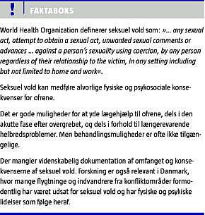 Ifølge FN's flygtningehøjkommissariat anslås det, at der i dag findes 15,2 millioner flygtninge i verden foruden asylansøgere og internt fordrevne [1]. Antallet er steget i nyere tid som følge af, at krige og andre former for væbnende konflikter har ændret karakter. Størstedelen af krigsofre i dag er civile. Væbnede konflikter øger al form for seksuel vold, inklusive voldtægt. Ikke mindst kvinder og børn på flugt er særligt sårbare [2]. Således anslås det, at 20.000-50.000 muslimske kvinder blev voldtaget under krigen i Bosnien i 1992-1995, hvilket svarer til 1,2% af den samlede kvindelige befolkning [3]. Seksuel vold er enten en konsekvens af tilfældig, voldelig adfærd eller en del af en bevidst fremgangsmåde, hvor det bruges som en systematisk strategi til at pine, straffe og nedbryde enkeltindivider, familier og hele samfund. Seksuel vold begås af fjendtlige soldater, men også af soldater i flygtningelejre, hvis opgave det er at beskytte kvinder og børn. Når samfundsordnen er kaotisk, er overgrebsmændene ligeledes ofte civile borgere [4]. Danmark har modtaget ca. 75.000 flygtninge gennem de seneste 15 år fra områder med væbnede konflikter, og formodentlig har et ukendt antal heraf været udsat for seksuel vold med fysiske og psykiske konsekvenser til følge, hvilket også gør problemstillingen relevant lokalt [5].