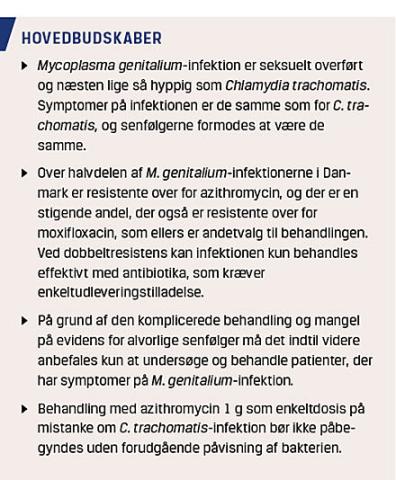 Næstefter klamydia er M. genitalium-infektion den hyppigste bakterielle SOI i Danmark, men diagnostikken kan være vanskelig på grund af lav bakteriemængde, og behandlingen er kompliceret på grund af få aktive antibiotika og tiltagende resistens mod disse.