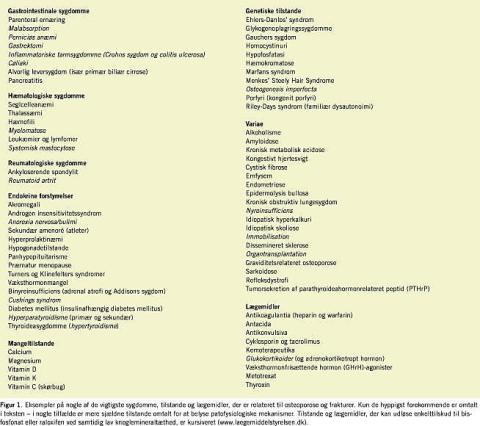ITabel 1 vises en oversigt over ændringerne i knoglemineraltæthed (BMD) og frakturrisiko ved forskellige sygdomme, der er relateret til sekundær osteoporose.