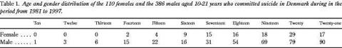 Vi identificerede 496 unge i alderen 10-21 år, som havde begået selvmord i perioden 1981-1997, for hvem der i CPR var oplysninger om den biologiske mor, og som havde boet i Danmark i det foregående år. De unges alder og køn fremgår af Tabel 1 . Hver person blev matchet med en repræsentativ gruppe på 50 individer af samme køn, som var født det samme år og var i live på tidspunktet for indekspersonens selvmord, for hvem der også eksisterede oplysninger om den biologiske mor i CPR, og som boede i Danmark det foregående år. Dette resulterede i udvælgelsen af 24.800 kontrolpersoner.