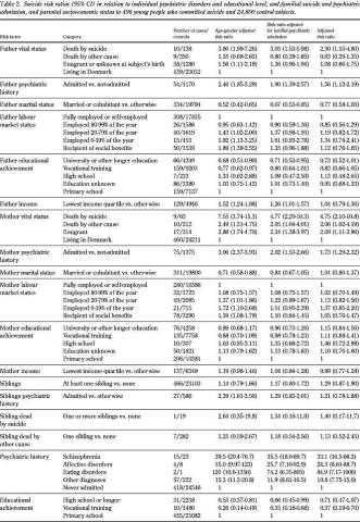 Resultater: Forøget risiko for selvmord blandt unge var relateret til forældrenes selvmord eller tidlige død, forældrenes psykiatriske indlæggelser, arbejdsløshed, lav indkomst, ingen eller kort uddannelse, skilsmisse og psykisk sygdom og kort skolegang hos de unge selv. Den stærkeste risikofaktor var psykisk sygdom hos den unge selv. Effekten af forældrenes socioøkonomiske forhold mindskedes efter kontrol for selvmord og psykisk sygdom i familien.