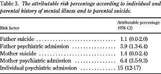 Summary Suicide in young people - familial, psychiatric, and socioeconomic risk factors - nested case-control study. Ugeskr Læger 2002; 164: 5786-90. Introduction: The objective of the study was to estimate the risk of adolescent and early adulthood suicide related to adverse family and individual backgrounds. Material and methods: The 496 young people aged 10-21 years who committed suicide during the period 1981-1997 in Denmark and 24,800 gender-age-time-matched controls. Results: Parental suicide, early death, hospitalised mental illness, unemployment, low income, educational under-achievement, parental divorce, mental illness in siblings, as well as mental illness and shorter schooling in the adolescents themselves were associated with increased risk of suicide. In the multivariate analysis, the odds ratios associated with suicide or mental illness in father or mother were 2.30 (95% CI 1.10-4.80), 1.56 (1.12-2.19), 4.75 (2.10-10.8) and 1.73 (1.29-2.32), respectively. The strongest risk factor was mental illness in the adolescents themselves with risk ratios 33.1 (16.5-66.5), 24.3 (6.64-88.7), 84.9 (7.17-1006) and 10.8 (7.75-15.0) for individuals hospitalised with schizophrenia, affective disorders, eating disorders or other psychiatric diagnoses and with an overall attributable risk of 15% (12-17%). The effect of parental socioeconomic variables decreased after adjustment for family history of mental illness. Discussion: Important targets in youth suicide prevention could be to decrease the prevalence of or ameliorating the negative effects of psychiatric illness including early recognition and optimal treatment. Reports of high relative risk associated with parental low socioeconomic status may be confounded and overestimated if not adjusted for the association with mental disorder and suicide in the family.