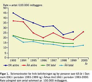 I undersøgelsesperioden 1993-2000 fandt man i Århus Amt i alt registreret 709 selvmord, heraf 176 hos personer over 65 år, 108 hos mænd og 68 hos kvinder. I Figur 1 vises selvmordsraterne for hele befolkningen og for ældre i Danmark i perioden 1993-1999 og for Århus Amt i perioden 1993-2000. Selvmordsraterne for den samlede befolkning er faldende både på landsbasis fra 22 til 14 i 1999 og i Århus Amt fra 21 til 12 i 2000. I Århus Amt ligger hyppigheden således lidt under landsgennemsnittet. Hos ældre er der på landsbasis et relativt jævnt fald i raten fra 45 til 26, og i Århus Amt ses raten at være lidt svingende, men med en faldende tendens fra 37 til 26 set over hele tidsperioden.