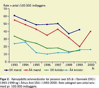 Formål: Formålet med undersøgelsen var retrospektivt at undersøge udviklingen af selvmordsrater og at analysere mulige risikofaktorer for selvmord hos personer > 65 år i Århus Amt fra 1993 til 2000 og at sammenligne resultaterne med resultaterne af en tilsvarende undersøgelse fra perioden 1983-1992.