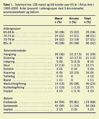 I Tabel 1 vises antal/procent af selvmord i aldersgrupper med femårsintervaller, selvmordsmetoder og boform. Hyppigheden er højest hos eneboende og hos aldersgruppen > 80 år. Hængning var den hyppigste selvmordsmetode hos mænd (36%), og medicinforgiftning var den hyppigste metode hos kvinder (38%).