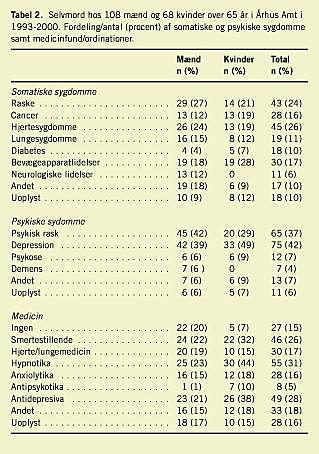 I Tabel 2 er der angivet somatisk sygdom, psykisk sygdom og medicinfund. 93% af kvinderne og 80% af mændene fik mere end en type medicin. 24% var efter oplysningerne somatisk raske, og 37% var angivet som psykisk raske. Ca. 13% var på dødstidspunktet i psykiatrisk behandling enten ved en psykiatrisk afdeling/distriktspsykiatri eller ved en privatpraktiserende psykiater. Yderligere 11% havde tidligere været i psykiatrisk behandling. 19% havde tidligere forsøgt selvmord. Hos 35% blev der fundet et afskedsbrev. Det fremgår af disse afskedsbreve og af øvrige oplysninger, at godt 47% angav sygdom som årsag til selvmordsbeslutningen. Ca. 18% angav håbløshed og ligeledes 18% angav økonomi/manglende arbejde som årsag, og hos ca. 16% var årsagen uoplyst. I alt 9% var registreret som værende såvel somatisk som psykisk raske. I 10% af tilfældene forelå der ikke oplysninger om somatisk helbredstilstand, og i 6% forelå der ingen oplysninger om psykisk helbredstilstand, hvorfor disse tilfælde blev registreret som uoplyste.