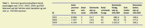 Materiale og metoder: Der er foretaget en kvantitativ analyse af data fra indberetninger til Dansk Røde Kors Asylafdeling om selvmordsadfærd blandt personer over 15 år i perioden 2001-2003 og af medicinske journaler på 54 suicidale asylansøgere i Danmark i 2001.