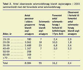 Gennemsnitsalderen for suicidale asylansøgere var lavere end gennemsnitsalderen for øvrige suicidale personer i Fyns Amt (χ2-test) (p = 0,0001) (Tabel 2). Det forventede antal selvmordsforsøg er beregnet ud fra raten for selvmordsforsøg i Fyns Amt i samme periode. Det ses, at antallet af observerede selvmordsforsøg er 3,4 gange højere blandt asylansøgere end blandt øvrige suicidale personer i Fyns Amt i samme periode.