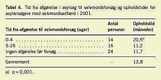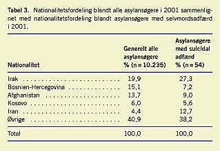 Resultater: Antallet af selvmordsforsøg er 3,4 gange større end det forventede i forhold til den fastboende befolkning i perioden, og selvmordsforsøgsraten har været stigende i de efterfølgende to år, der indgår i undersøgelsen. Selvmordsadfærd forekommer hyppigst blandt asylansøgere på 30-39 år. Der er nationalitetsforskelle. Den foretrukne metode ved selvmordsforsøg er indtagelse af medicin. Stressrelaterede tilstande udgør tre fjerdedele af diagnoserne blandt suicidale asylansøgere i 2001. Lang opholdstid (20,8 måneder) kombineret med afslag ser ud til at medvirke til hurtig udvikling af selvmordsadfærd efter afslag. Men andre faktorer må også være gældende, da 44% af selvmordsforsøgene forekommer inden for seks måneder efter ankomsten til Danmark.